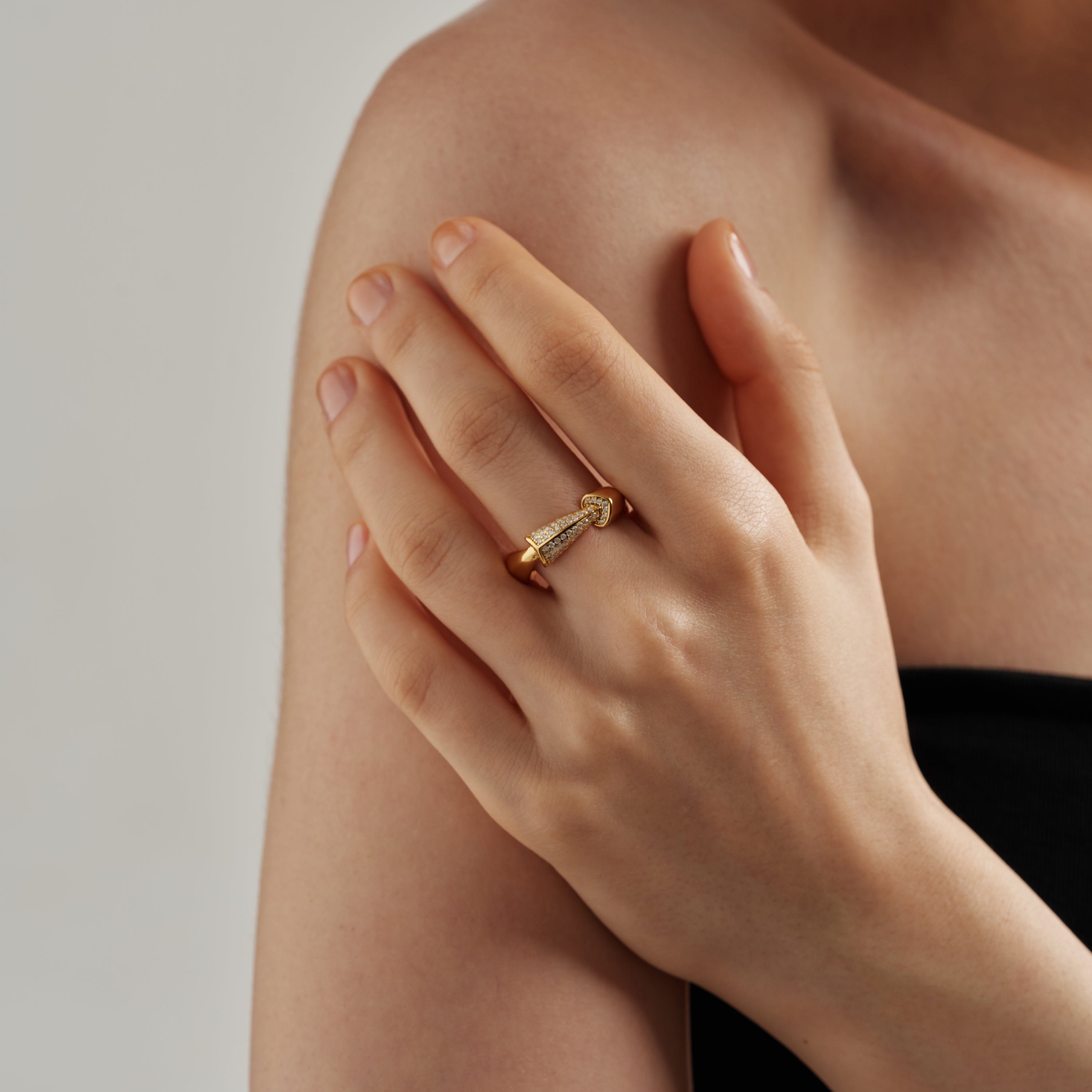 The collection celebrates basic geometric elements, remastered to sculptural compositions and aesthetics, engendering a sleek and daring look. The sculpturesque visual of some pieces is created by an original placement of the piece on the body.